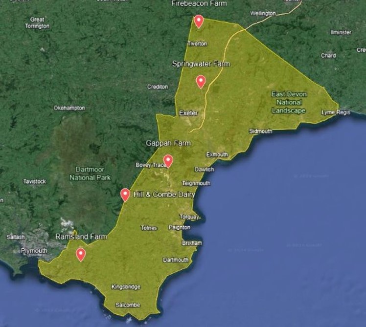 - Applications should be from community groups located near the five focus farms: Springwater Farm, Gappah Farm, Hill Combe and Dairy, Ramsland Farm and Firebeacon Farm (see image)